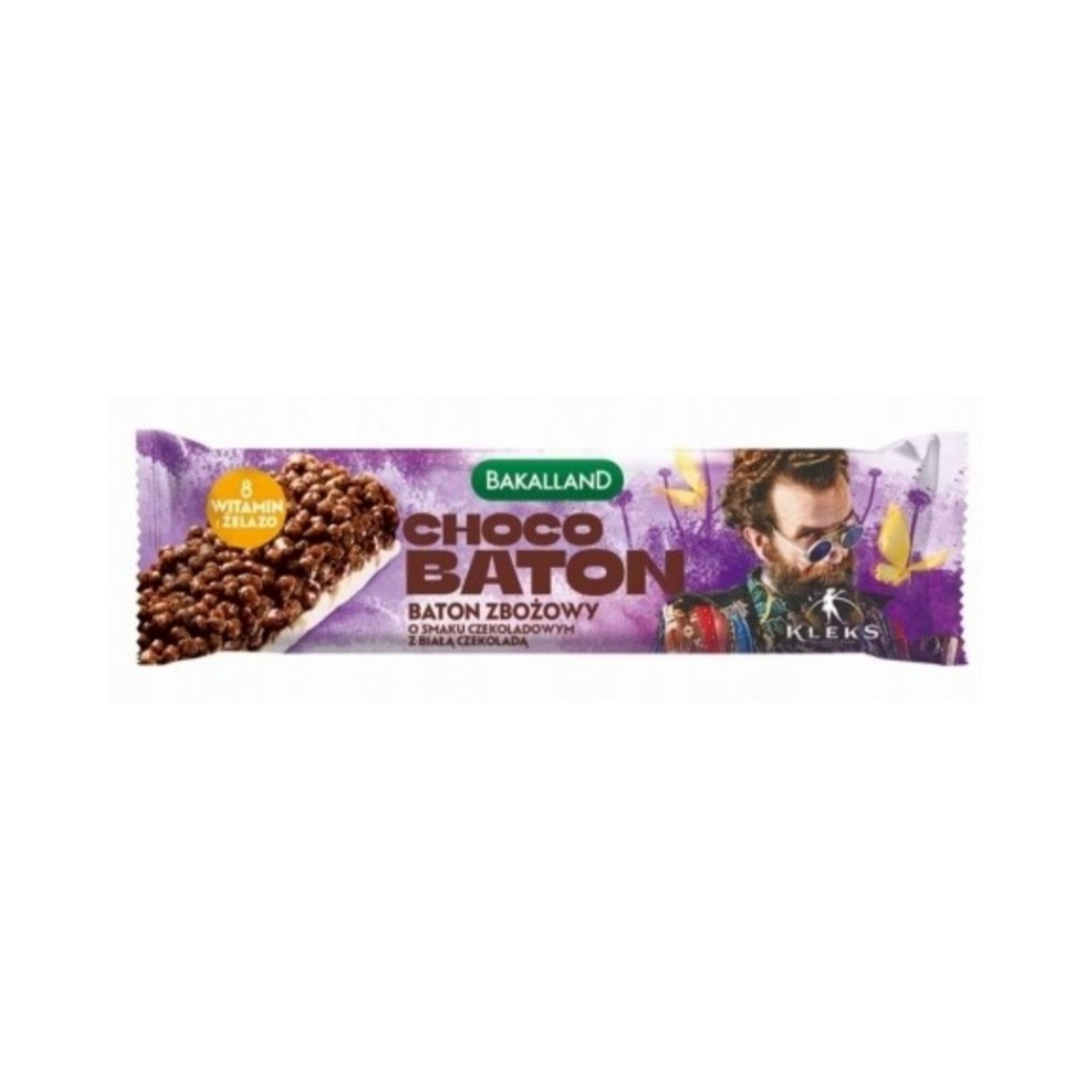 Baton zbożowy o smaku czekoladowym z białą czekoladą.